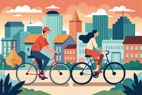 Happy people riding bicycle, walking with dog, taking selfie in city park, flat vector illustration. Outdoor leisure activity.