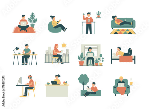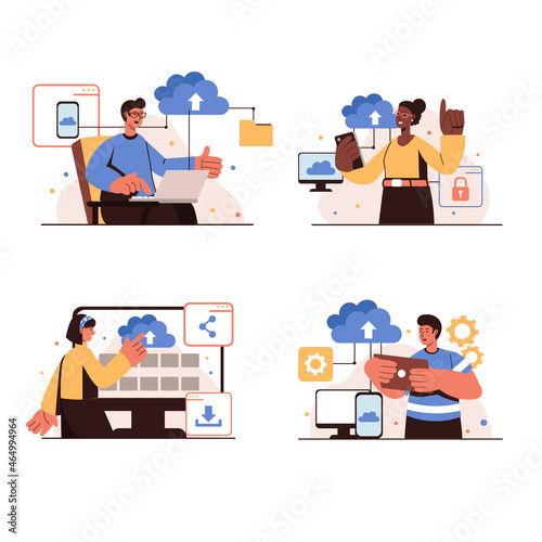 Happy people sending and receiving presents, flat vector illustration. Fresh flowers, pizza, gift box. Birthday, anniversary, romantic presents. Online gift delivery service.