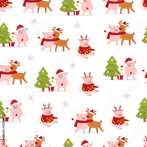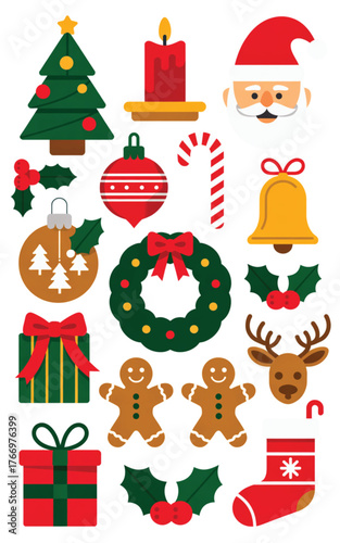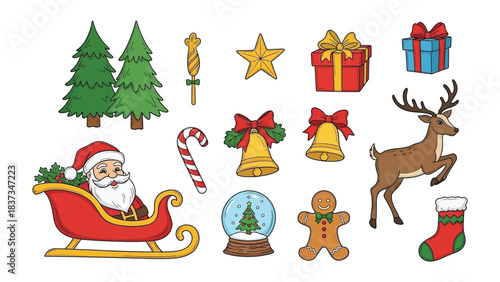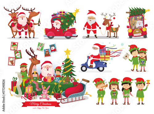 Merry Christmas set, flat vector isolated illustration. Happy Santa Claus with gifts, chinese zodiac 2021 sign, cute ox ice skating, ringing the bell, holding sparklers. Happy New Year celebration.