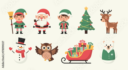 Merry Christmas set, flat vector isolated illustration. Happy Santa Claus and cute ox, chinese zodiac 2021 sign with gifts, Christmas tree, ball, wreath, bell. Happy New Year celebration.