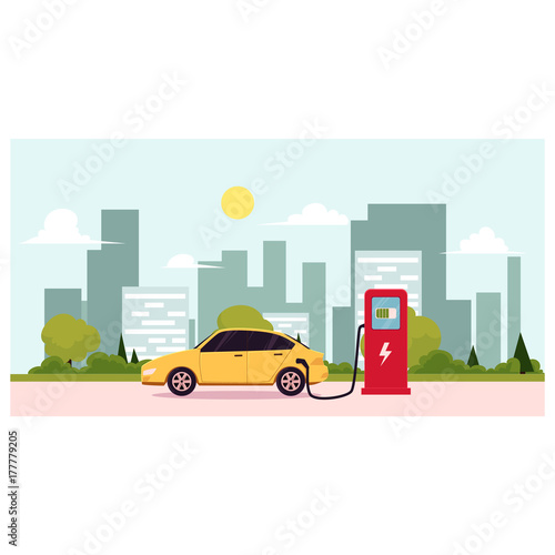 Happy schoolboy, student with backpack boarding yellow school bus, flat vector illustration. School transportation service.
