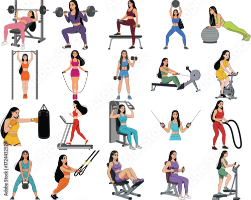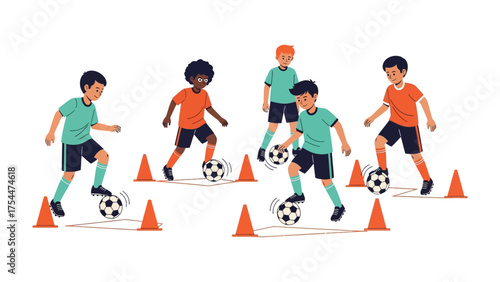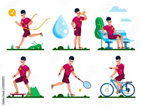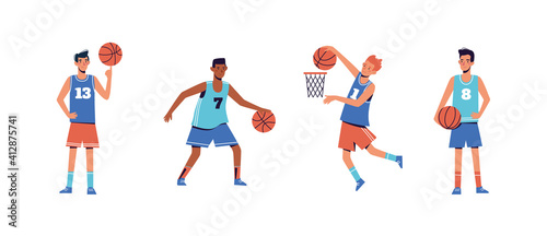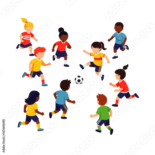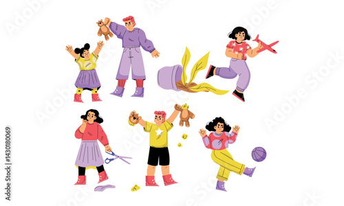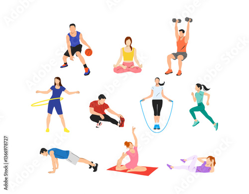 Happy sports kids isolated vector set on white. Little boys and girls playing with basketball and soccer ball, racket, training with hula hoop and jumping rope, doing active workout illustration