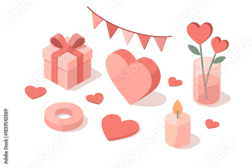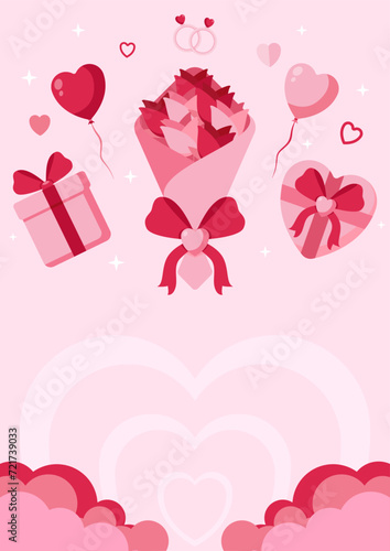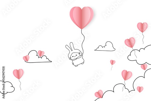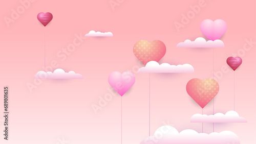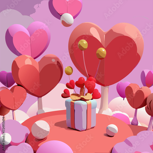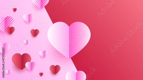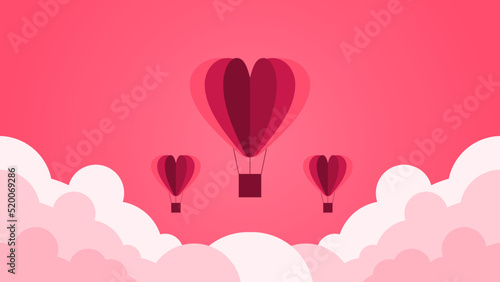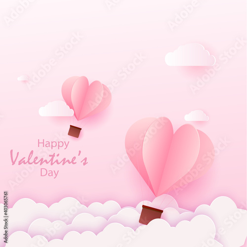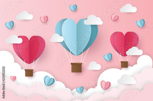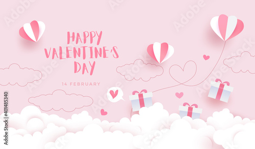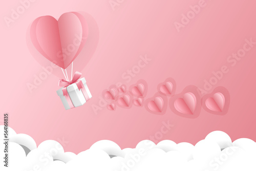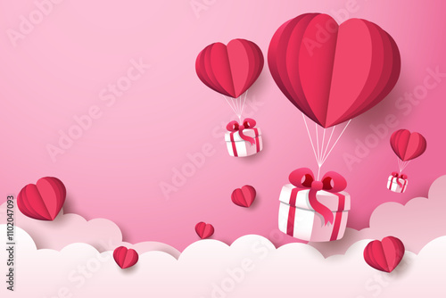 Open love gift box with hearts, hot air balloons, ribbons flying out of it. Vector illustration in paper art craft style. Romantic love. Happy Valentines Day greeting card, poster, banner template.