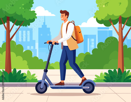 Happy woman riding kick scooter, flat vector illustration. Eco friendly city transport. Active lifestyle. Urban electric scooter.