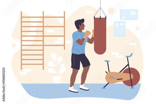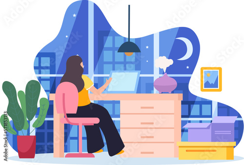Happy woman spending free time at home. Cute girl doing gymnastics, practicing yoga in the morning, flat vector illustration. Home fitness, everyday workout routine, sport and hobby, healthy lifestyle