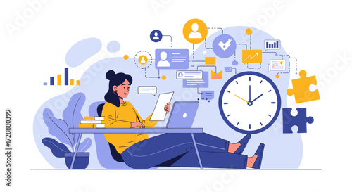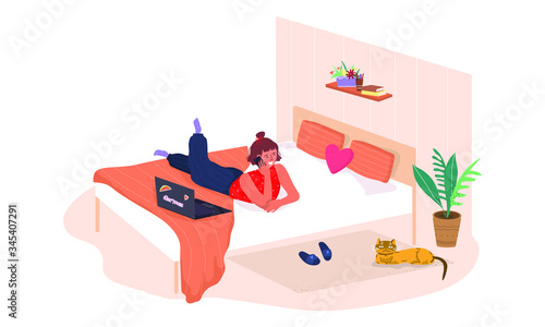 Happy woman taking bath lying in bathtub with mobile phone in hand, flat vector illustration. Home bathroom interior. Young people lifestyles. Social media and smart phone addiction.