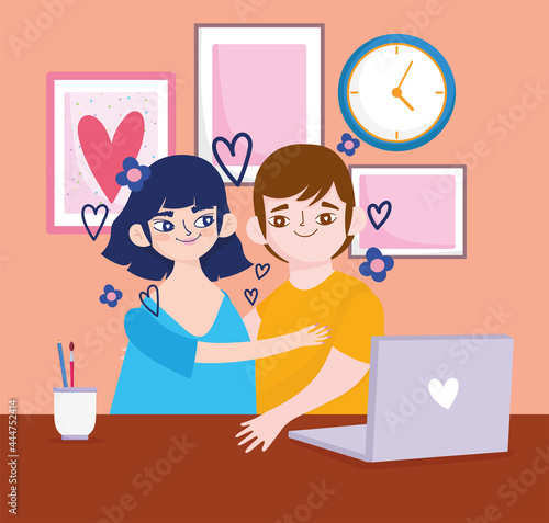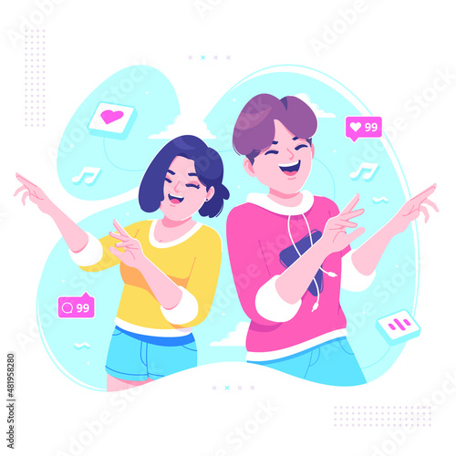 Happy women using mobile devices for chatting with boyfriend over video call and taking selfie in park, flat vector illustration. Landing page design, website banner template set.