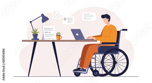 Happy young man using wheelchair admiring piece of art, flat vector illustration. Arts therapy, healing and mental wellbeing.