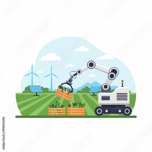Combine harvester gathers the wheat in the field, and automatically loads it in the truck. Vector illustration in flat design