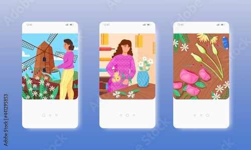 Woman healer gathering different herbs and cooking magic potion. Occultism. Mobile app screens. Vector banner template for website and mobile development. Web site and UI design illustration.