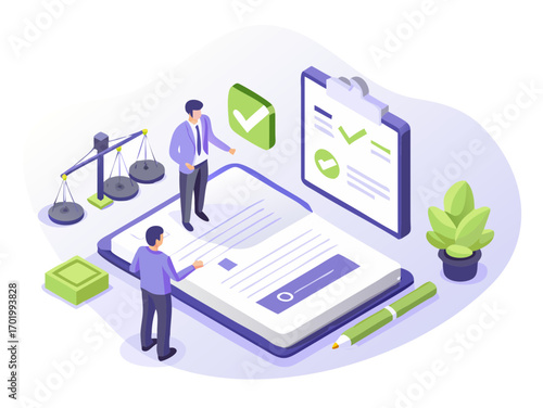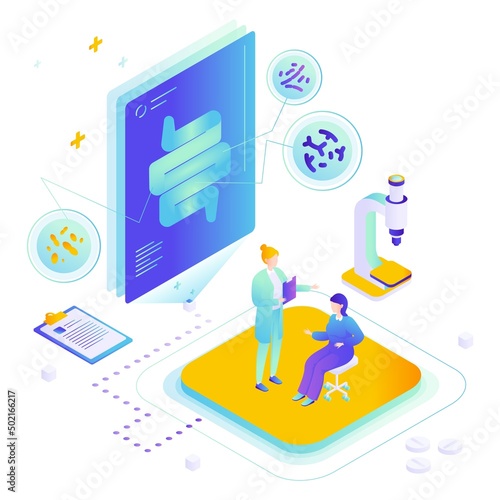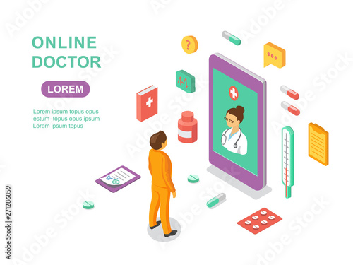 Health insurance policy online, 3d isometric vector illustration. Medical insurance plan concept with doctor, patient, medical form with shield, pills on mobile screen, calculator, piggy bank, money.