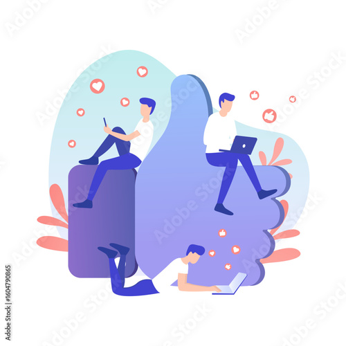 Huge apple and micro male and female characters cooking meal with blueberry, chicken egg, vector illustration. Healthy diet, veggie food, vegan nutrition concept for web banner, website page etc.