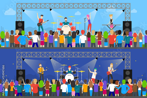 Heavy metal rock festival celebration vector illustration. Open air party in city park with musical band performing on stage, excited crowd of people dancing under starry night sky
