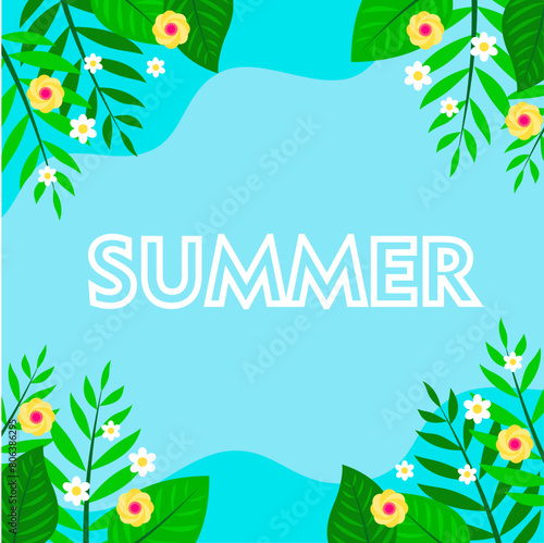 Green foliage, Hello Summer inspirational seasonal quote hand lettering typography, vector illustration in paper art craft style. Beautiful floral summer composition for poster, banner, website page.