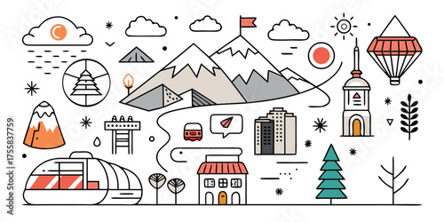 Hike advertising vector illustration. Modern thin line art flat style design element with camping and hiking symbols, icons for website banners and printed materials.