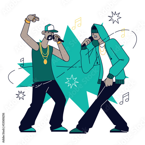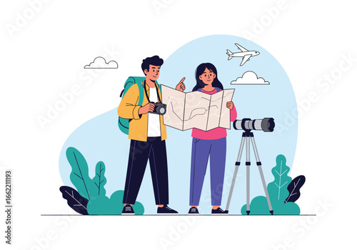 Hiking scene, flat vector illustration. Traveler, hiker couple with backpacks, camera, water bottles going hiking in forest. Trekking, mountain tourism, adventure, expedition, nature discovery.