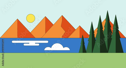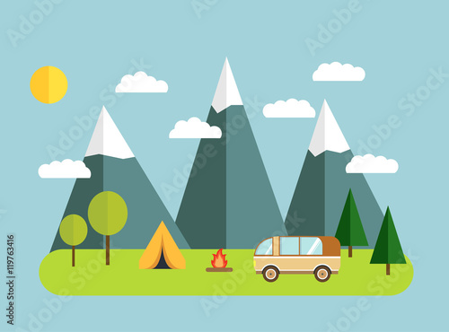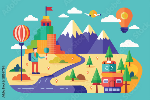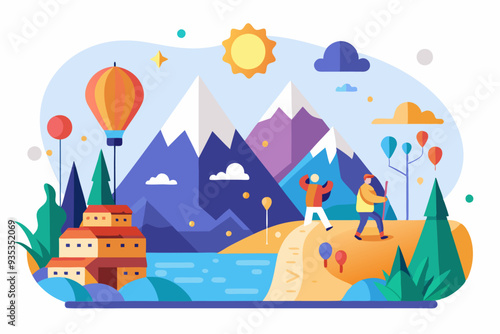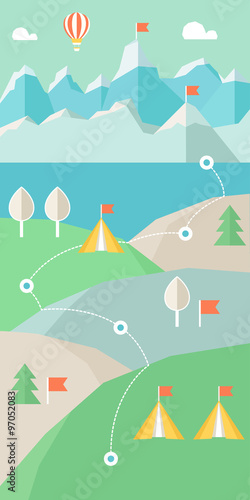 Hiking in a park isometric objects on mobile phone screen. Vector illustration in flat 3d style. Outdoor activity in mountain forest. Stay online everywhere concept illustration.