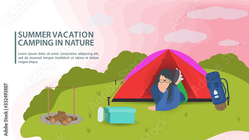 Hiking scene, flat vector illustration. Hiker male character sitting at tent and campfire. African american traveler camping, hiking. Trekking, summer tourism, adventure, expedition.