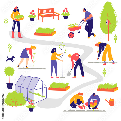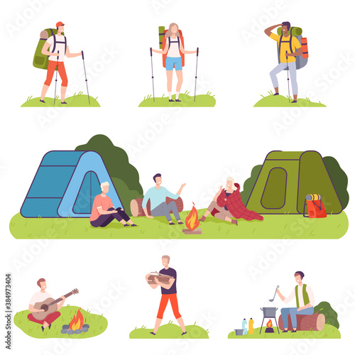 Hiking scene set, flat vector illustration. Travelers, hikers with backpacks going hiking, cooking meal on fire, climbing rock. Trekking, mountain tourism, travel adventure, expedition, summer camping