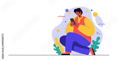 Group of tourists sitting near tent and cooking meal on fire, vector illustration. Camping, hiking, trekking concept for web banner, website page etc.