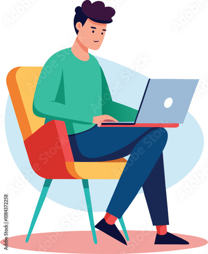Hipster man listening radio podcast using mobile tablet vector icon isolated background.