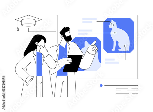 History museum exposition, flat vector illustration. Couple of visitors viewing ancient artifact collection such as extinct animal footprint, human bones, crockery, pottery.