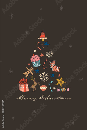 Holiday Christmas and New Year card template. Vector poster with hand drawn symbols. Gift boxes form Christmas tree.