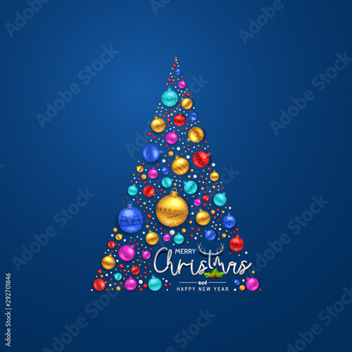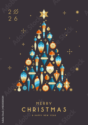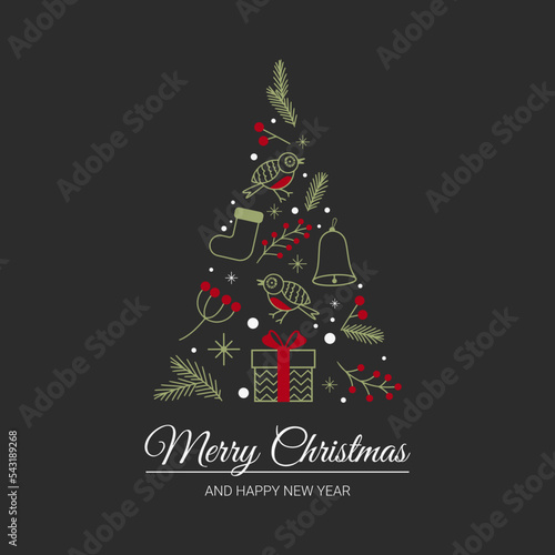 Holiday Christmas and New Year card template. Vector poster with hand drawn symbols. Gift boxes form Christmas tree