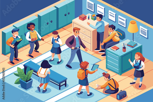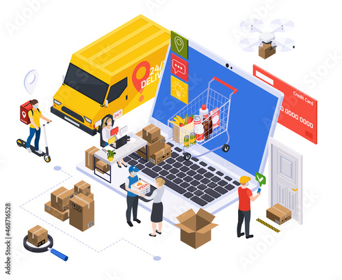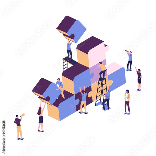 Home auction, vector illustration. Isometric residential house building, auctioneer with gavel and people with bid paddles. Auction and bidding composition for web banner, website page etc.