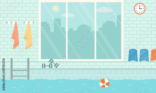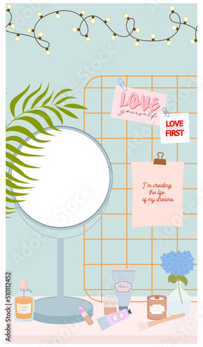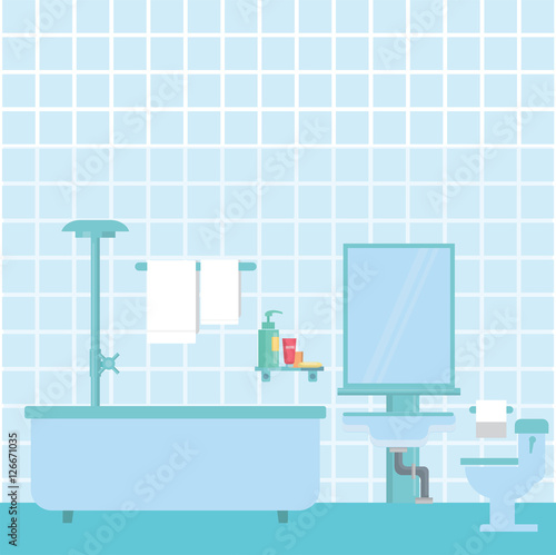 Home bathroom design interior. Bathtub filled warm water with soap bubbles and computer laptop on tray prepared for watching relax video or working vector illustration scene