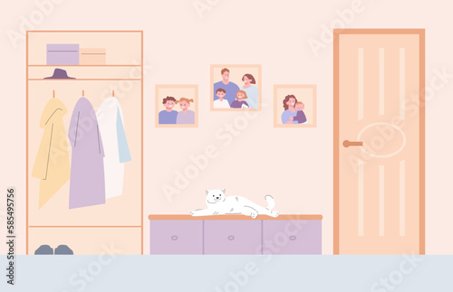 Modern home bathroom design interior with shower behind curtains on rack and sink vector illustration