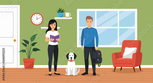 Home cleaning scene, flat vector illustration. People cleaning hall. Professional cleaner worker characters doing housework washing window, floor, vacuuming furniture. Housekeeping services.