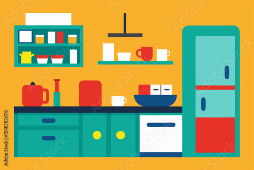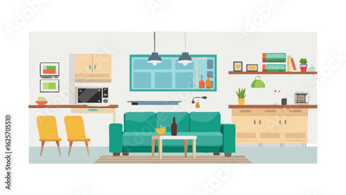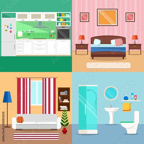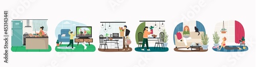 Home cleaning scene set, flat vector illustration. People cleaning bathroom, living room, washing dishes and windows, folding clothes. Housekeeping and dishwashing services. Daily housework routine.