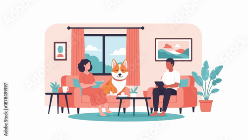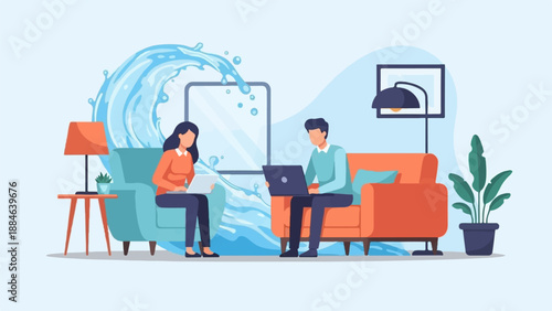 Home cleaning scene set, flat vector isolated illustration. People mopping floor, doing laundry, caring for houseplants, dishwashing, dusting, washing dog. Daily routine, cleaning company service.