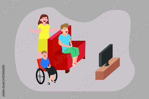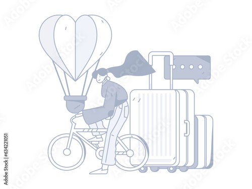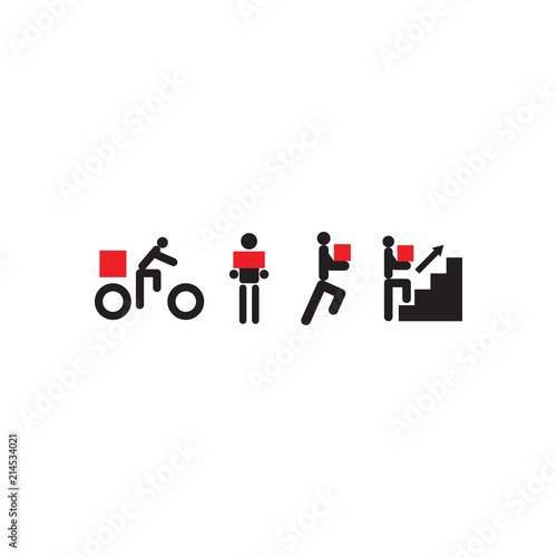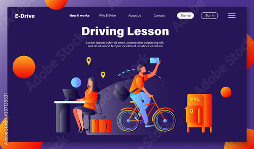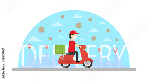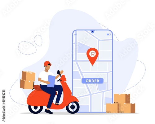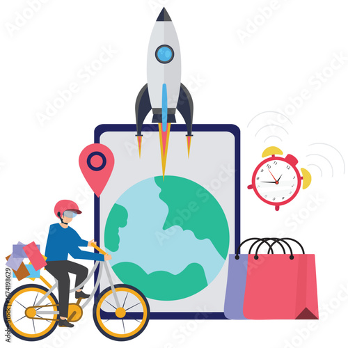 Young man courier delivering parcel to woman door by bicycle, vector flat style design illustration. Bike messenger, home delivery service concept for poster, banner etc.