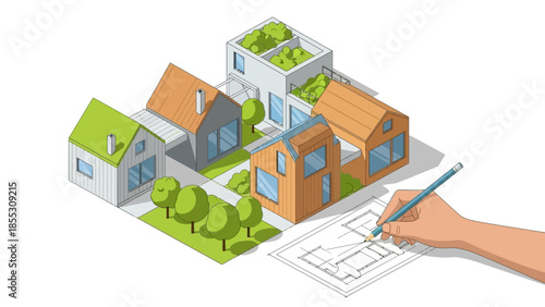 Home insurance policy stopping domino effect, flat vector isometric illustration. Home protection from theft, damage, natural disaster. Real estate, property insurance.
