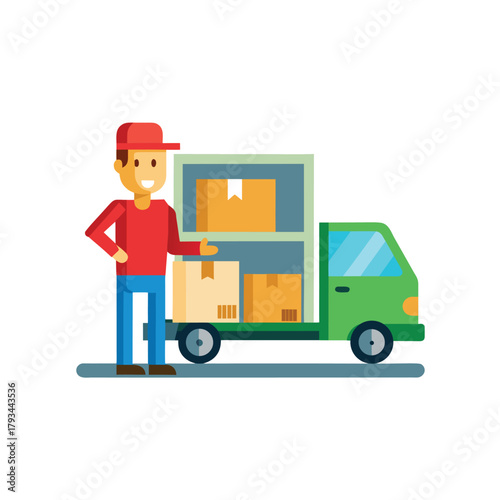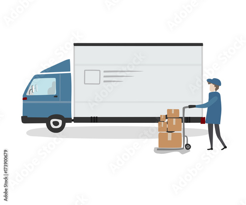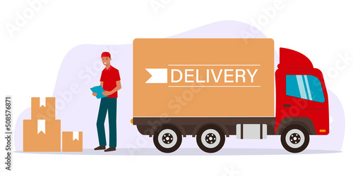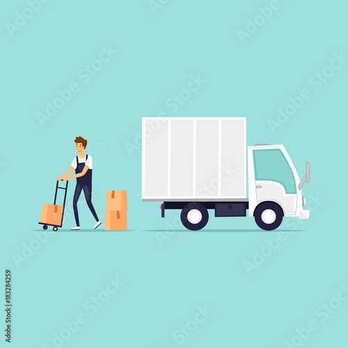 Home moving and relocation set, flat vector isolated illustration. Delivery truck, workers, loaders, movers carrying cardboard boxes, sofa, assembling furniture. Moving and delivery company services.