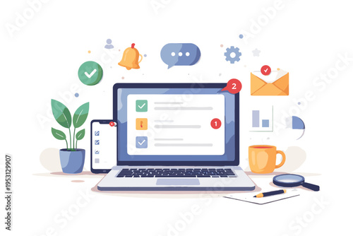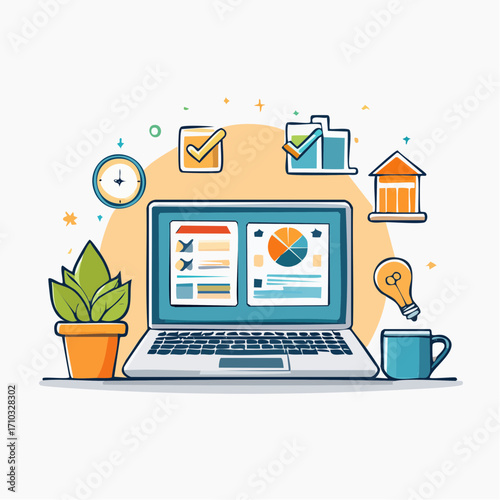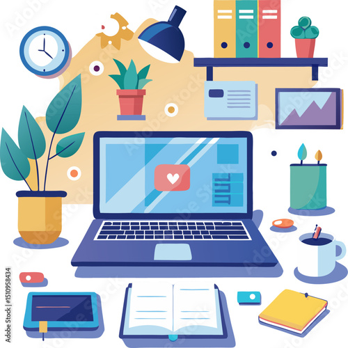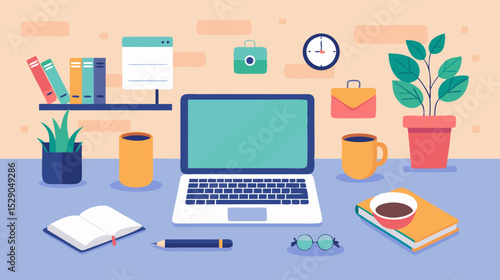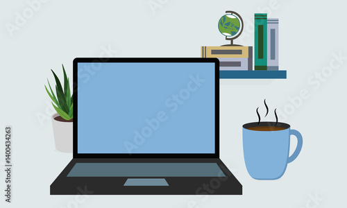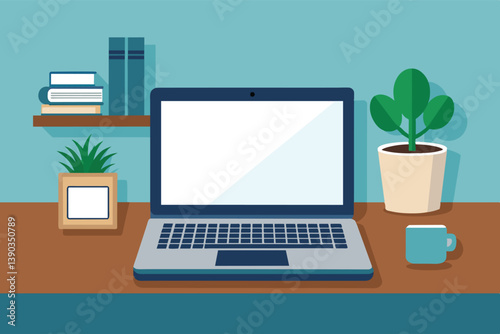 Modern home office vector poster template. Desktop with laptop computer, houseplant, books, pen, pencils, flat style design illustration. Home workspace.