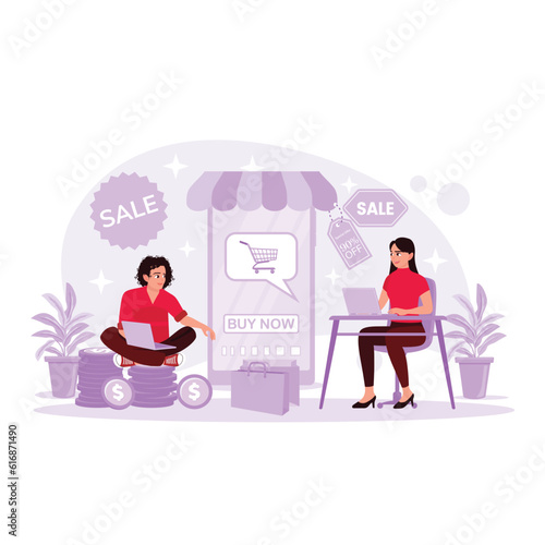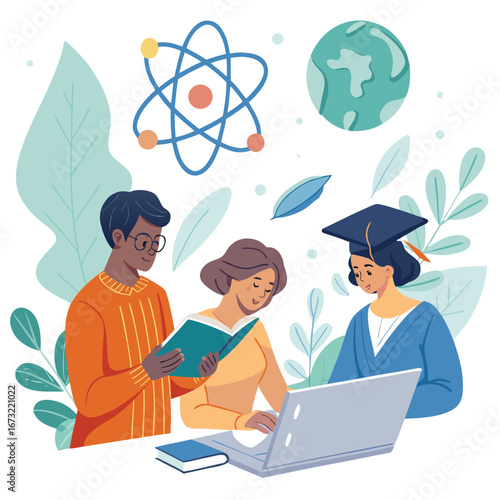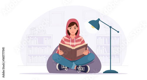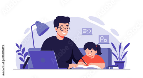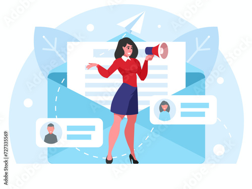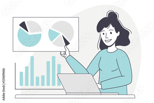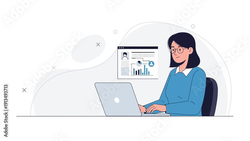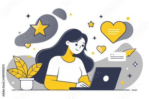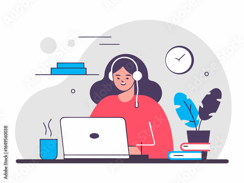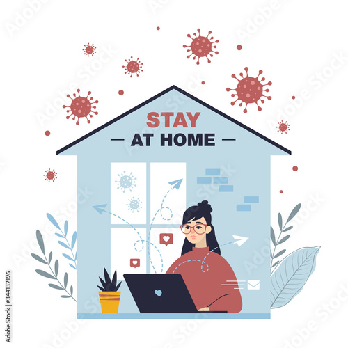 Home office vector. Young woman cartoon character working on laptop computer. Female freelancer or student having online chat flat illustration