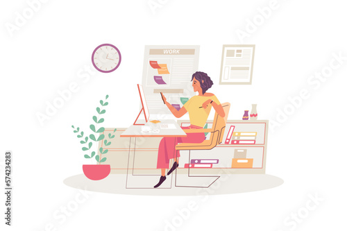 Home office vector website template, web page and landing page design for website and mobile site development. Young mom working on laptop sitting at table at home. Freelance remote work concept.