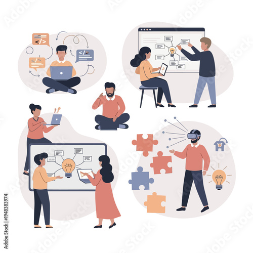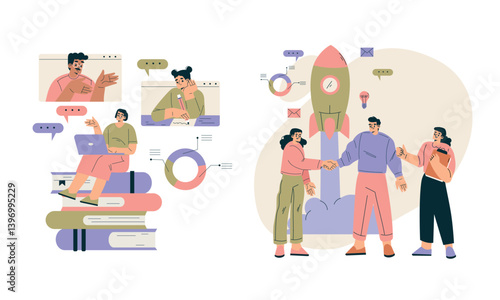 Home repair and cleaning services set, vector flat illustration. Cleaning ladies doing laundry, vacuuming carpet, cleaning house. Electrician, plumber changing light bulb, fixing clogged kitchen sink.