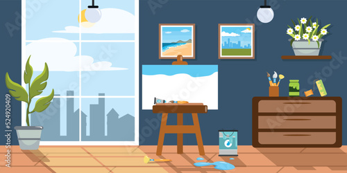 Home repair and improvement, wall decor. Interior designer decorating living room, flat vector illustration. People painting mural on the wall, arranging houseplants, installing shelves.