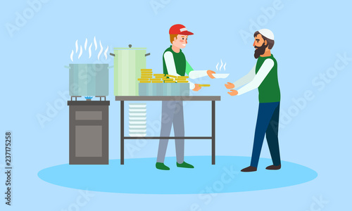 Volunteers donating clothes, providing medical assistance, preparing foods to homeless people, vector flat isolated illustration. Care for homeless, volunteering and charity.