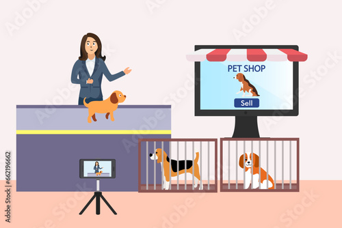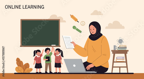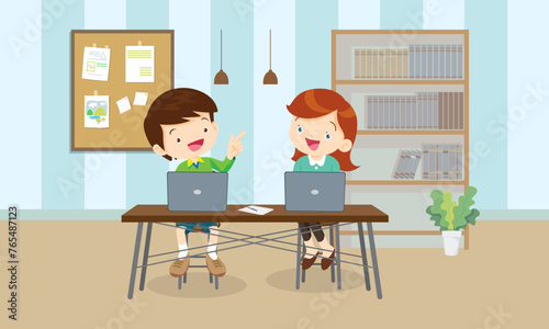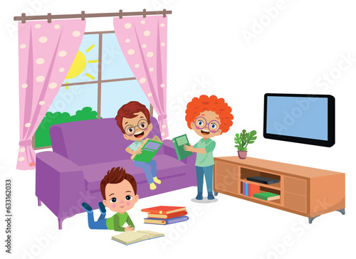 Vector illustration of happy cute girl doing homework. Flat style design.