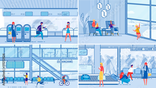 Horizontal banner with doctors and hospital interiors. Medicine concept. Patients passing medical check up. Flat cartoon illustration.