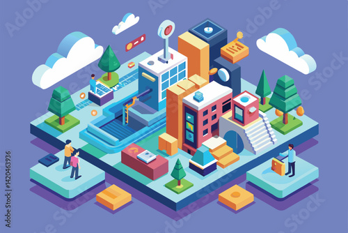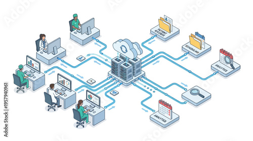 Hospital or medical clinic doctor office, drugstore isometric flowchart, vector flat illustration. People patients buying prescription drugs in pharmacy store after visiting doctor or ordering online.