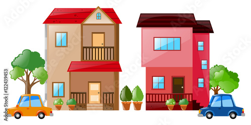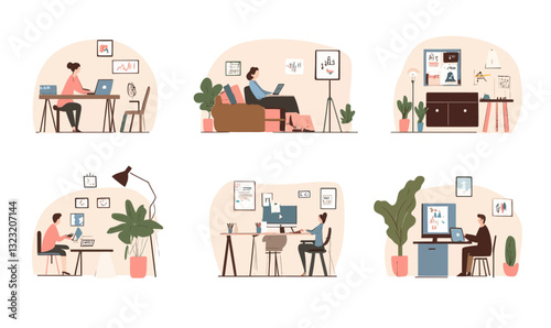 Hostel set, flat vector illustration isolated on white background. Hostel building, reception, cafe, lockers, shower, laundry room, bed, tourist couple, girl working on laptop.
