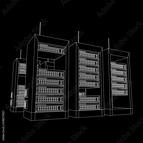 Server racks low poly wireframe mesh made of points, lines and shapes. Vector polygonal art style illustration. Hosting server, computer database concept poster banner template.