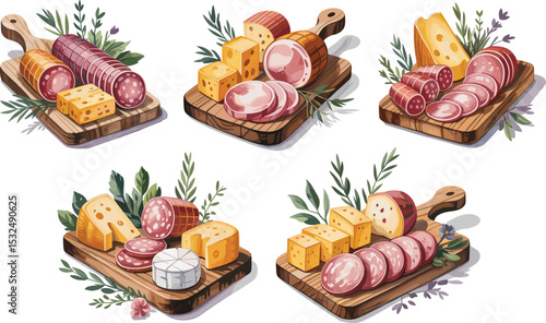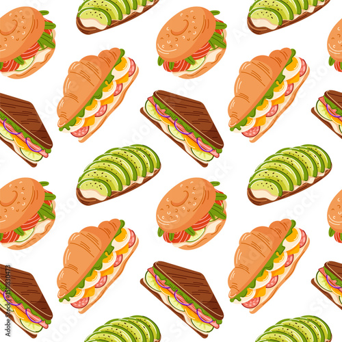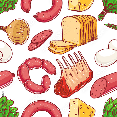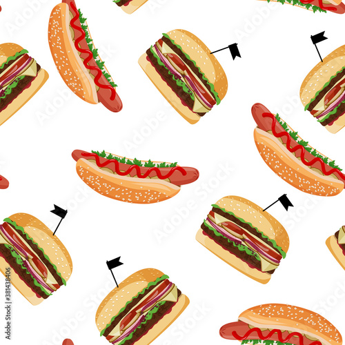 Hot dog and its ingredient set, vector illustration isolated on white background. Realistic sausage, hot dog bun, lettuce leaves, tomato, cucumber, onion, pepper slices, mustard and ketchup. Fast food