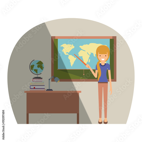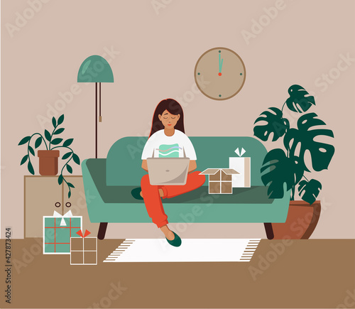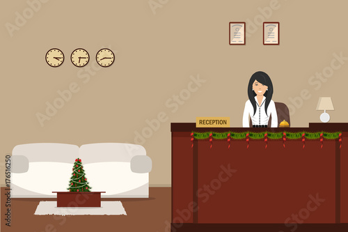 Hotel housemaid vector illustration. Cleaning lady or housekeeper pushing cart with clean bed linen and towels in flat style.